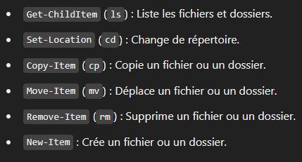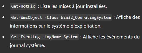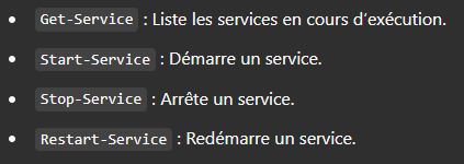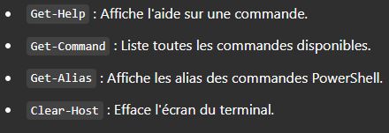 - Pipeline : Permet d'enchaîner les cmdlets en passant des objets d'une commande à une autre (Get-Process | Where-Object {$_.CPU -gt 50}).