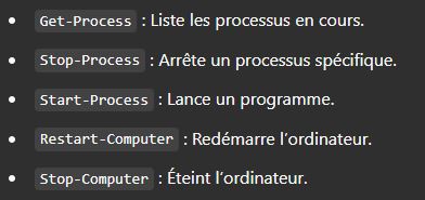 - Cmdlets (Command-lets) : Petites commandes conçues pour des tâches spécifiques, comme Get-Process ou Stop-Service.